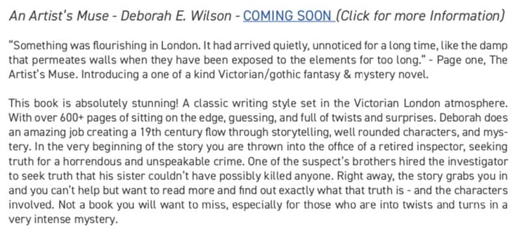 Facebook – Twitter/X – Goodreads – Rate and Review email: contact@deborahewilsonauthor.co.uk